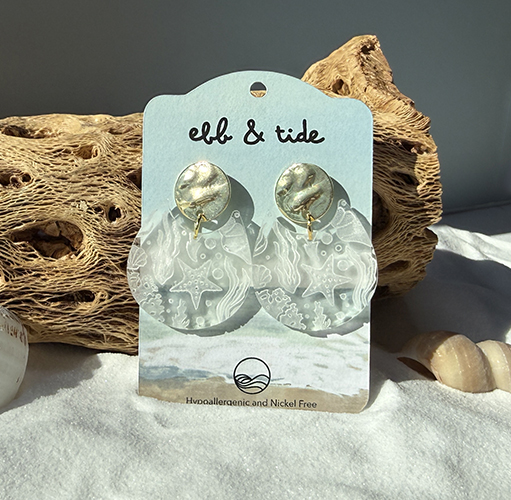 These clear acrylic earrings feature a delicately engraved ocean-inspired design, capturing the calm beauty of the sea in a light, airy style. Lightweight and effortlessly elegant, they’re finished with hypoallergenic hardware for comfortable, all-day wear.