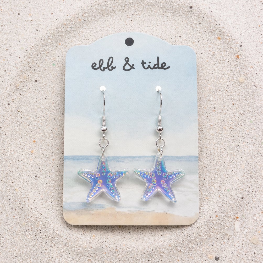 These earrings feature a translucent, iridescent starfish design that catches the light with soft coastal tones. Lightweight and comfortable, they’re finished with hypoallergenic hooks for easy, everyday wear.
